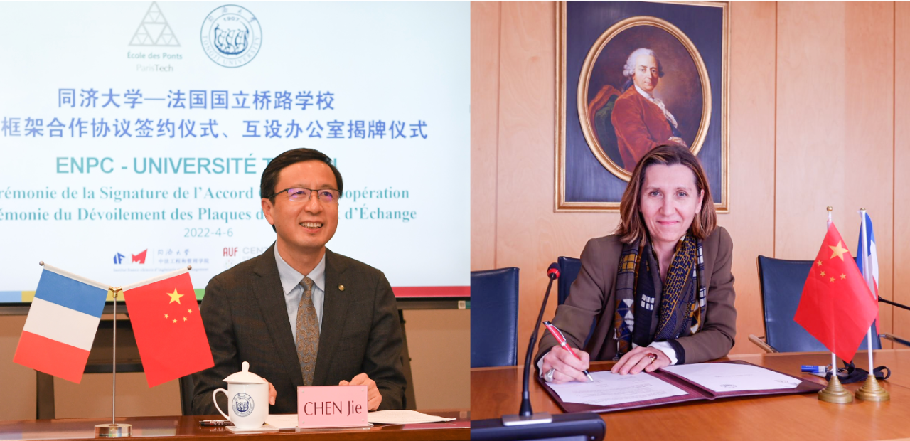 2022年4月,时任校长陈杰(左)代表学校与法国国立桥路学校签署框架合作协议