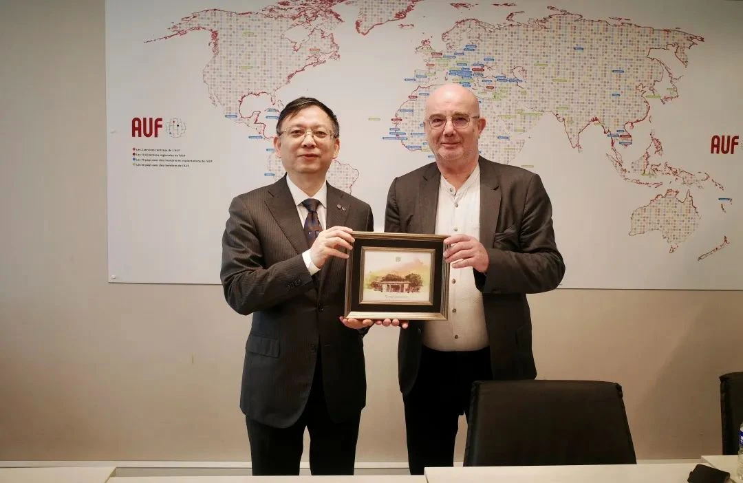 2023年4月,校党委书记方守恩(左)率代表团访问法国,与世界法语大学联盟有关负责人交流
