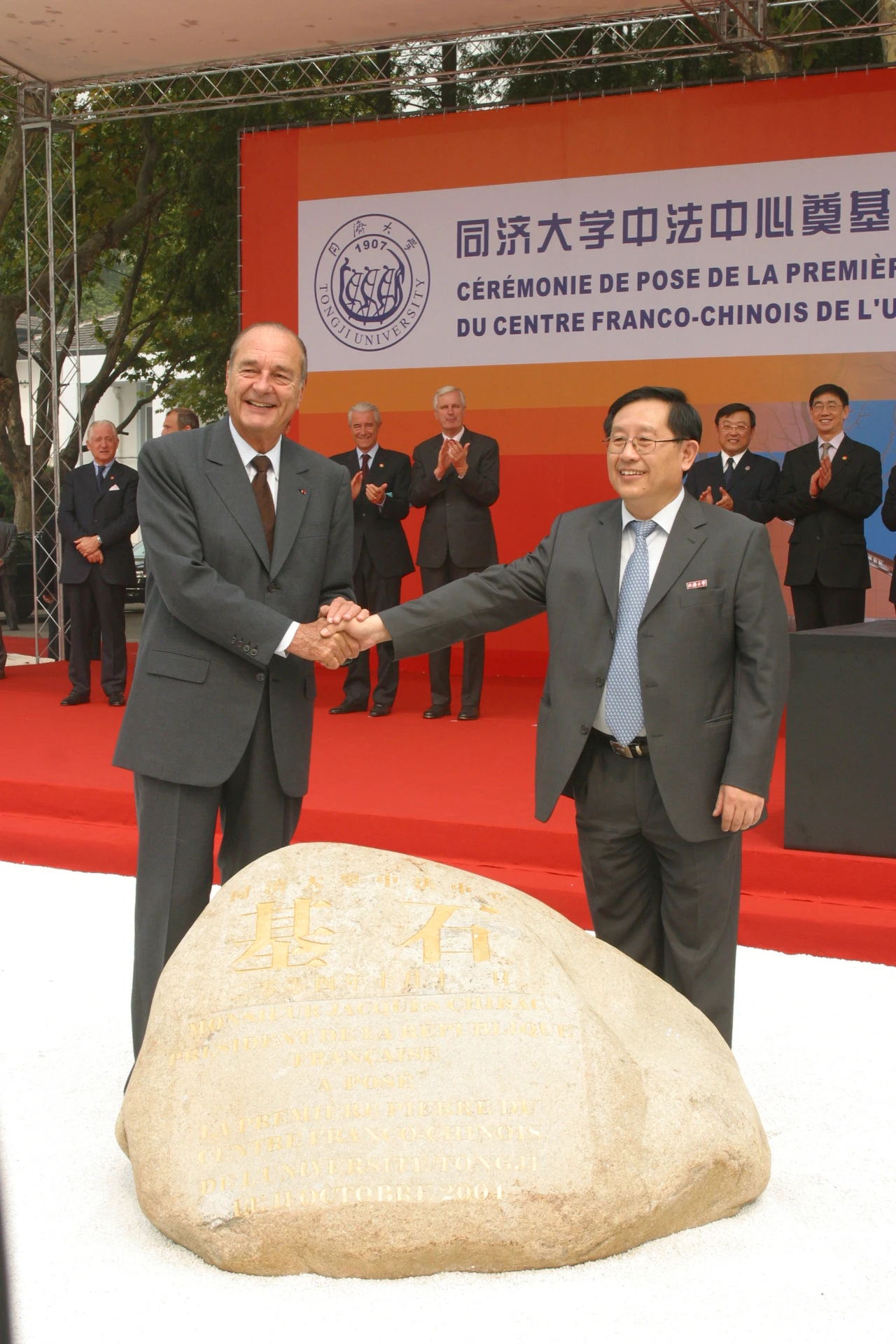 2004年10月,法国时任总统雅克・希拉克(左)访问同济大学,并与时任校长万钢(右)共同为中法中心大楼奠基