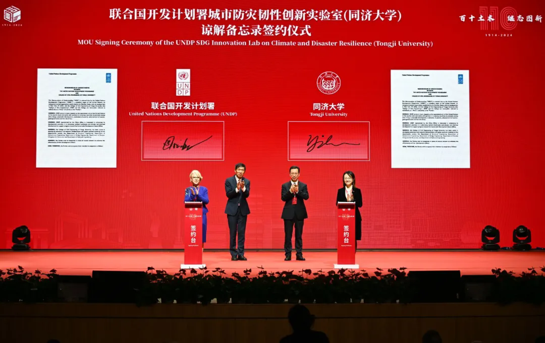 在徐浩良、郑庆华共同见证下,联合国开发计划署驻华代表处与同济大学土木工程学院共同签署谅解备忘录,双方将建立战略伙伴关系,共建联合国开发计划署城市防灾韧性创新实验室(同济大学),共同探索和试验旨在增强城市减灾和气候韧性的前沿技术解决方案,借助开发计划署的全球网络,促进中国与合作国家知识经验的交流与共享。这也是联合国开发计划署首次与中国高校在该议题下联合创设创新实验室。