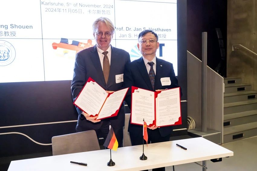 在卡尔斯鲁厄理工大学,校长赫斯塔文(Jan S. Hesthaven)、副校长赫尔特(Thomas Hirth)会见代表团一行,并与近20多名与同济大学有合作的德方教授一起共同出席两校伙伴关系建立25周年庆典活动。