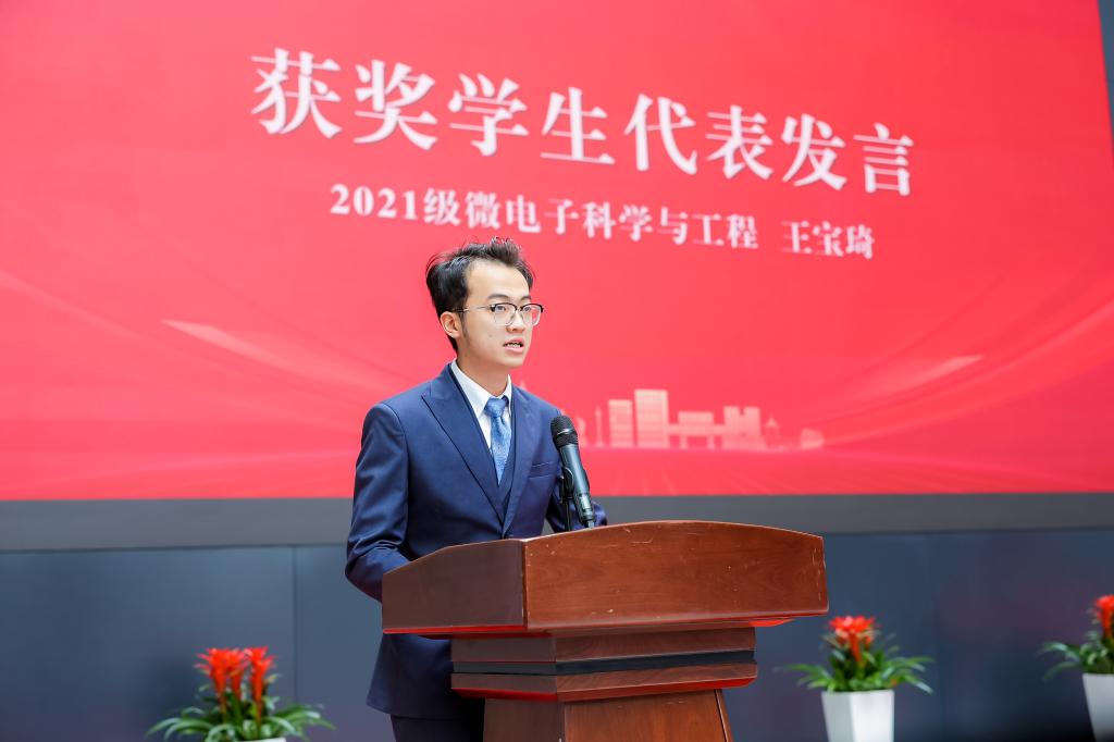 获奖学生代表2021级微电子科学与工程专业本科生王宝琦发言。他首先代表所有获奖学生向吴启迪教授、乔非教授、各位校友和老师致以崇高的敬意和由衷的感谢。他表示,启迪奖学金不仅引领青年学子在专业领域不断探索和创新,激发追求卓越、勇于挑战的精神,更能激励大家在未来的学习和工作中以更大的热情和决心投身于实践。生逢中华民族发展最好时期的青年学子,当以“制出将来之少年中国”为己任,以真才实学攻克“卡脖子”技术难关,积极弘扬启迪奖学金的精神,担时代之责,承报国之行,与学校同呼吸、共进步。
