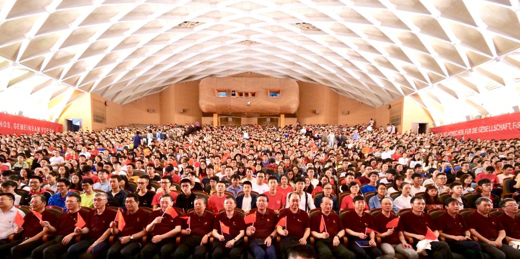 校党委书记方守恩表示,在新中国70周年华诞之际,同济大学举办了升旗仪式、纪念英烈、同济服务新中国建设70年图片展等活动。今天,学校开放礼堂、教室和食堂等场所供师生收看中央庆祝大会、阅兵和群众游行直播,校领导和近3000名师生一起在大礼堂集中观看,深切感受新中国成立70年来取得的伟大成就,这是一场十分生动的爱国主义教育课。礼堂现场座无虚席,气氛热烈,不时爆发出发自内心的热情掌声。习近平总书记在庆祝大会上的重要讲话气势磅礴、催人奋进,鼓舞了亿万中华儿女创造今天美好生活的斗志,更加坚定了全国人民夺取明天更大胜利的信心。同济师生将与全国人民一起,更加紧密地团结在以习近平总书记为核心的党中央周围,以习近平新时代中国特色社会主义思想为指导,把学习贯彻落实这次重要讲话精神作为当前和今后一个时期的重点任务,把时任上海市委书记习近平同志在2007年学校百年校庆大会上对同济百年办学的总结凝练作为进军中国特色世界一流大学的目标和要求,不忘初心、牢记使命,坚持立德树人根本任务,加强基础研究,主动对接国家重大战略重大建设,团结一心,“与祖国同行,以科教济世”,为实现中华民族伟大复兴中国梦不懈奋斗。