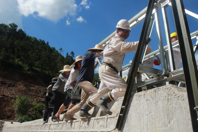 坐落于云南砚山县六主村的无止桥是同济无止桥团队主持的第一座人行桥。2016年暑假,学院师生到六主村踏访时发现村里道路泥泞难走,村民外出、学生上学极为不便,修桥需求十分紧迫。2017年春节刚过,还在寒假中的师生们来到六主村,在团队专业指导老师吴迅教授和团队管理指导老师吴培峰的带领下,同学们勘察地形、设计方案、比选材料、施工安装,忙得不亦乐乎。实践出真知,在老师们的鼓励下,队员们结合当地情况,尝试着对传统贝雷桥进行改进,设计出一种装配式人行贝雷桥,替代原来的网箱桥,大大改善了村民出行的安全便捷。为了方便更多有需要的人使用,他们还编写了《无止贝雷桥建造手册》,申请了《一种轻型装配式人行贝雷桥》实用新型专利。