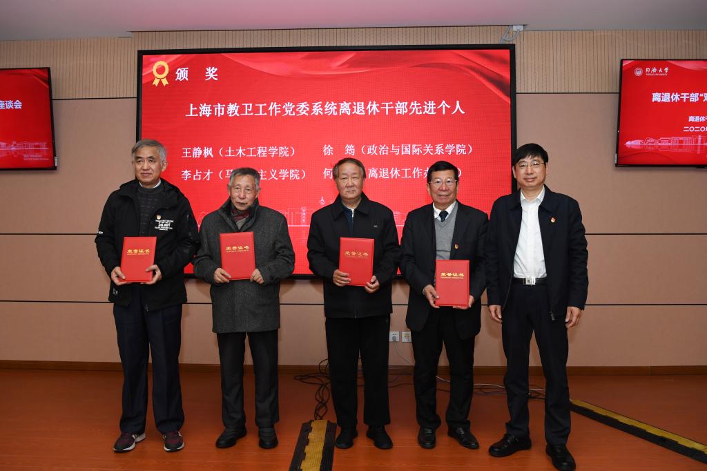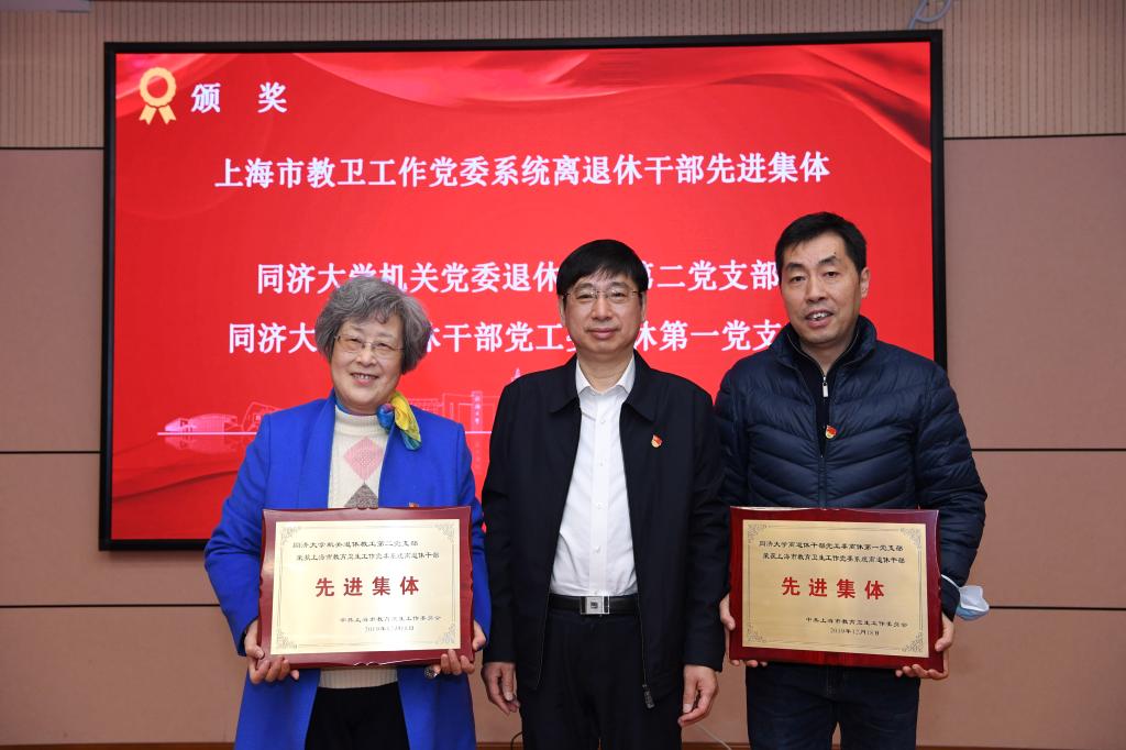 我校土木工程学院教授、中科院院士孙钧荣获“上海市离退休干部先进个人”称号;机关党委退休教工第二党支部、离退休干部党工委离休第一党支部获“上海市教卫工作党委系统离退休干部先进集体”称号;土木工程学院地下建筑与工程系退休党支部书记王静枫,政治与国际关系学院副教授、学院关工委老同志徐筠,马克思主义学院教授李占才,校离退休工作办公室原主任何仲节获“上海市教卫工作党委系统离退休干部先进个人”称号。吴广明为获奖的先进集体和个人颁发奖牌和证书。