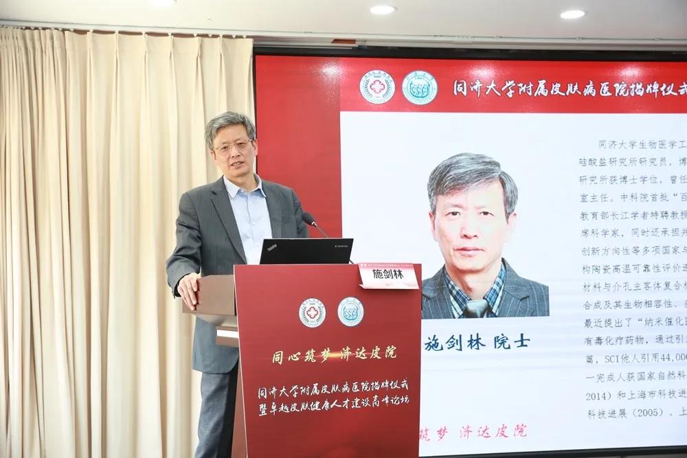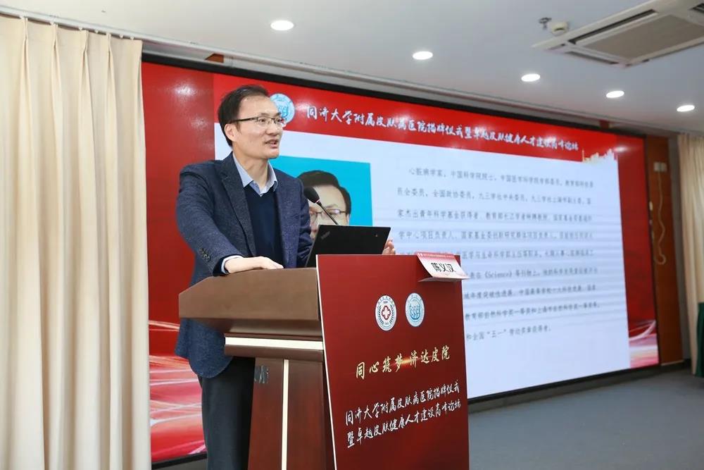 随后,卓越皮肤健康人才建设高峰论坛开讲。陈义汉作了题为《中国疾病防治研究:机遇与挑战》的主题报告。施剑林作了题为《纳米催化医学》的主题报告。