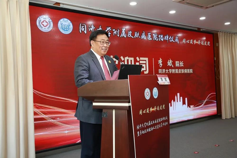附属皮肤病医院院长李斌对各位领导和嘉宾的莅临表示感谢。他讲述了皮肤病医院与同济大学的历史渊源。多年来,院校双方共同推动高水平大学附属医院建设,作出了不懈努力。他表示,今年是“十四五”的开局之年,医院将持续深化学科建设,促进临床技能的创新,推动互联网医院的区域专科建设。