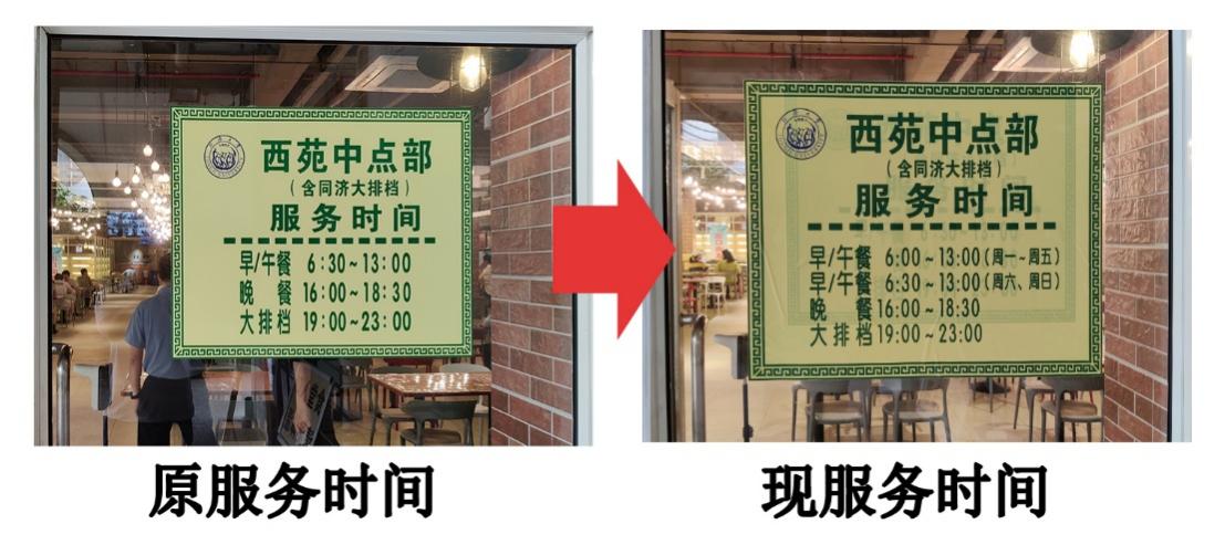 调整西苑中点部早餐供应时间。为了解决从四平路校区乘坐首发班车前往嘉定校区工作和学习的师生们的早餐用餐问题,四平路校区西苑中点部自5月18日起将营业时间从早上6:30提前至6:00,以便师生能够在乘坐班车之前享用完早餐,以良好的状态迎接一天的工作和学习,切实满足师生们的实际需求,增加师生的满足感和幸福感。
