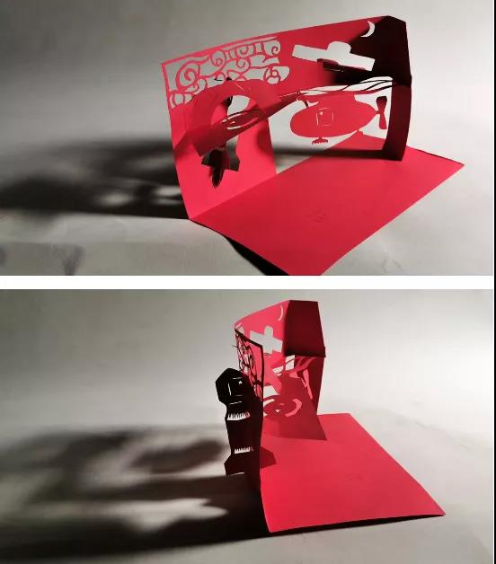 立体剪纸从平面剪纸中抽出祥云和绸带这两个元素,祥云环绕在绸带周围,有种把绸带托举起来的感觉,绸带的卷曲比较随意,给人以飘逸的感觉。