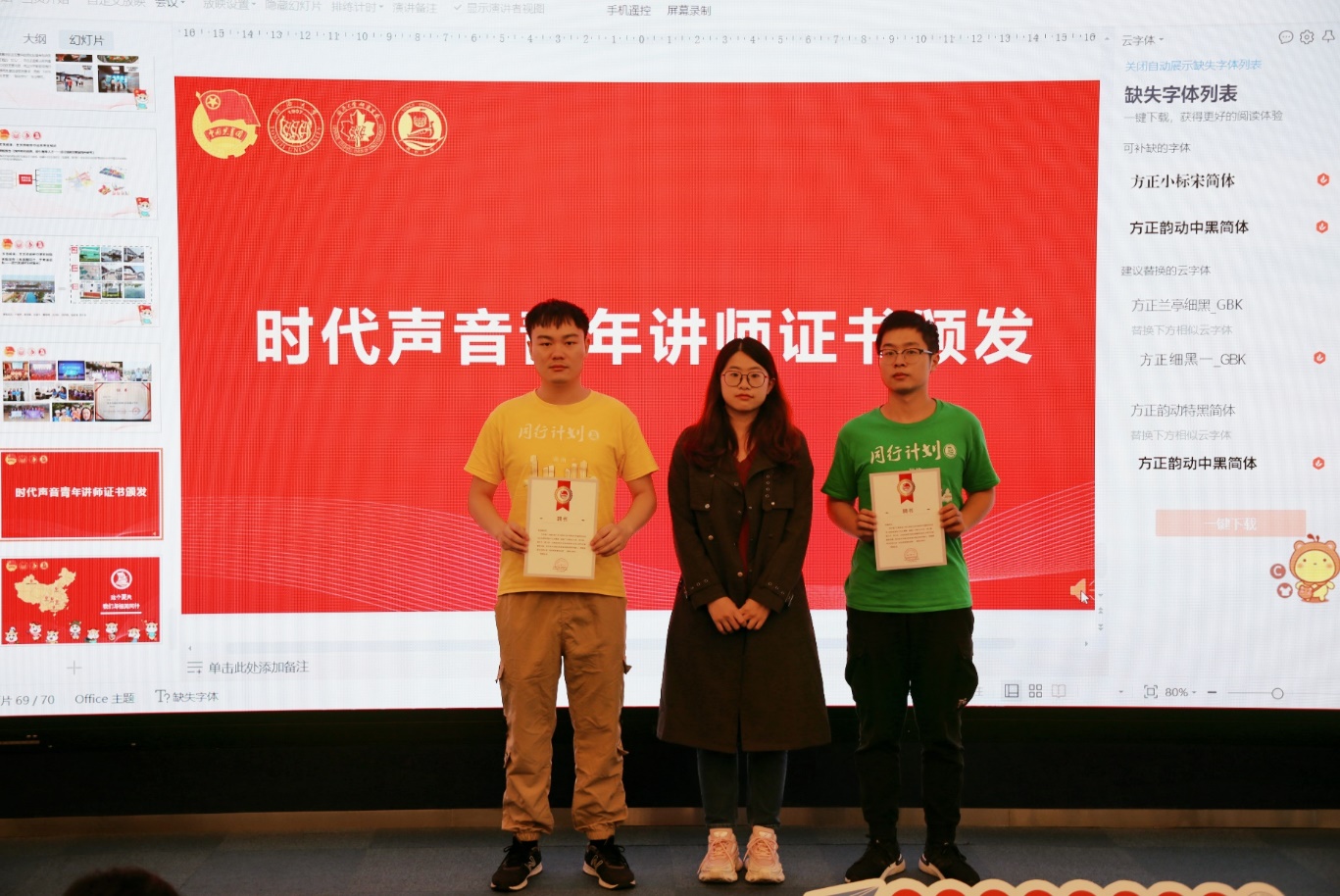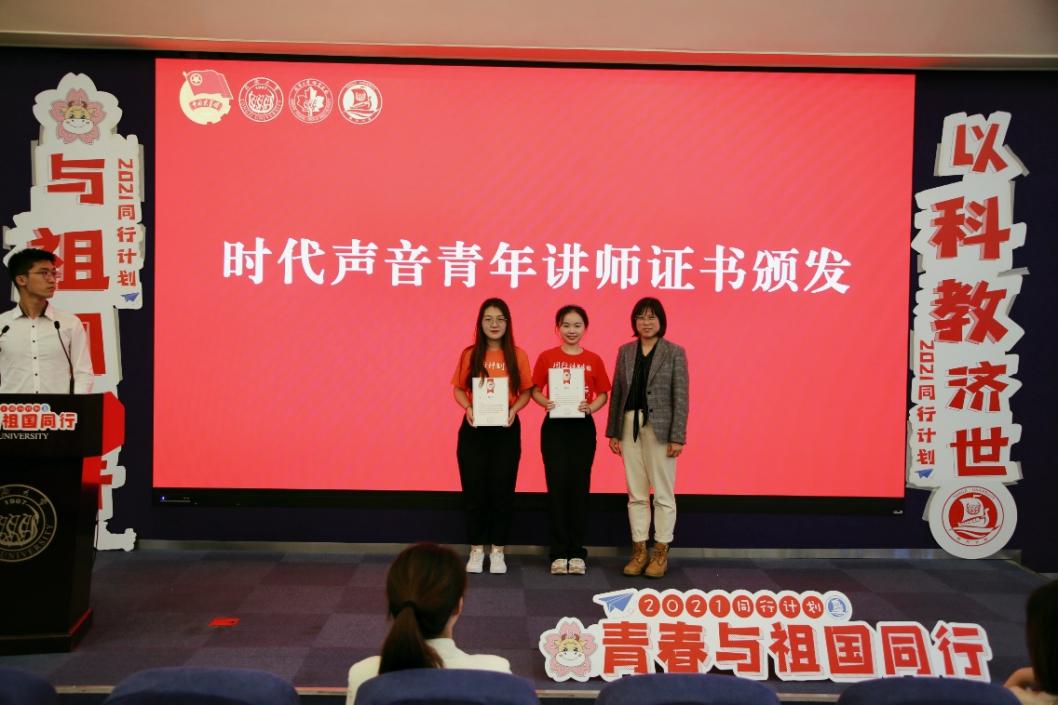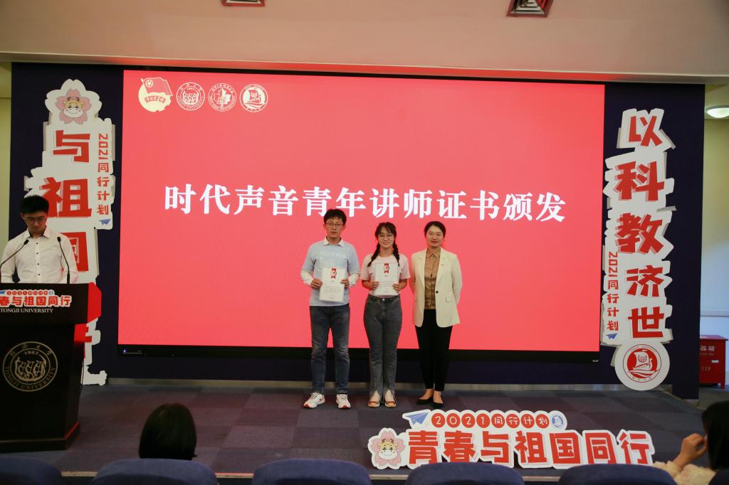 报告会最后,“同行计划”暑期实践锻炼指导教师为8名学生颁发了同济大学“时代声音青年讲师”聘书,希望同行学子以“时代声音青年讲师”的身份继续传播时代强音,以自己的实践经历和感悟影响激励身边更多的同学。