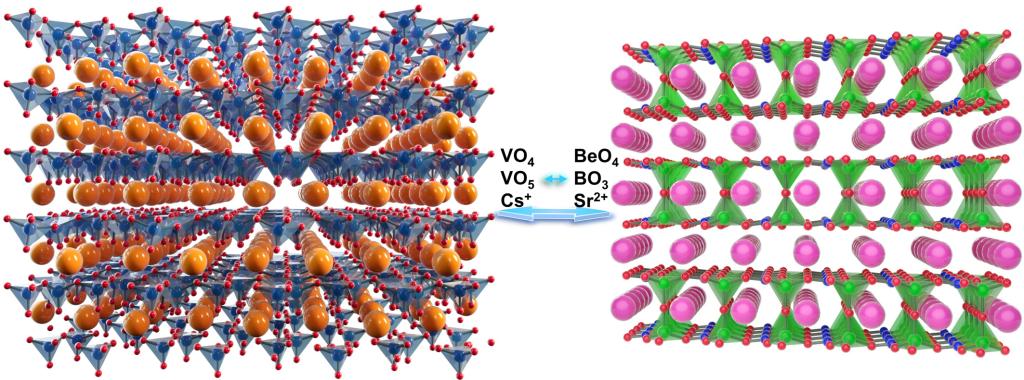 在这一研究中,张弛研究团队首次提出准刚性层结构调制晶态材料光学性能的设计思路,采用两种d0过渡金属中心阳离子基多面体[VOn](n = 4, 5)构建准刚性层状结构,探讨其对晶态材料二次谐波响应和红外透光范围的重要影响,当两种畸变的非线性光学活性基元[VOn]多面体在层状结构中对齐排列时,其微观极化方向基本一致,有利于获得最优化的宏观极性和二次谐波响应;相比于传统的非金属氧阴离子,由两种钒氧多面体[VOn]构建的层状结构可以提供低能的光学声子吸收,而层与层之间的特殊连接方式(如弱的层间相互作用、层间悬挂的氧原子等)可进一步降低晶态材料的最高声子频率,赋予材料宽的红外吸收截止边。