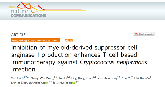 7月14日,同济大学附属第十人民医院贾鑫明教授、上海交通大学医学院附属瑞金医院瞿介明教授课题组合作在Nature Communications上发表了题为“Inhibition of myeloid-derived suppressor cell arginase-1 production enhances T-cell-based immunotherapy against Cryptococcus neoformans infection”的研究。该研究揭示了新型隐球菌主要荚膜多糖成分葡聚糖醛木糖甘露聚糖(glucuronoxylomannan, GXM)通过诱导机体粒细胞样髓系来源免疫抑制性细胞(PMN-MDSCs)的聚积及功能抑制机体对隐球菌的清除,加重感染,并通过进一步鉴定GXM的识别受体及下游通路为抗隐球菌感染提供了新的潜在免疫治疗靶点与策略。