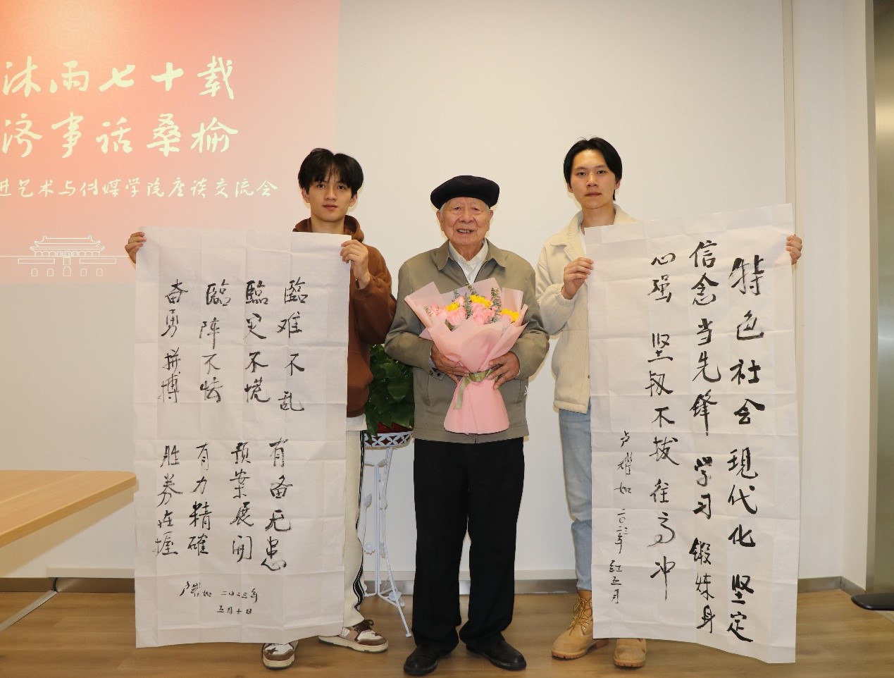交流会的最后,学生代表向卢耀如院士送上学院准备的礼物并献上鲜花和卢院士的素描画像。卢院士在著书《似水人生,如歌逐梦》上留下了签名与寄语,赠与在场师生。他还现场挥毫泼墨,为青年学子提出希望和期许,以期与大家共勉。师生们表示,将怀揣着对舞台艺术的热爱和对文艺事业的不懈追求,坚定信念、坚韧不拔地创作排演出更多“为时代画像、为时代立传、为时代明德”的优秀文艺作品。