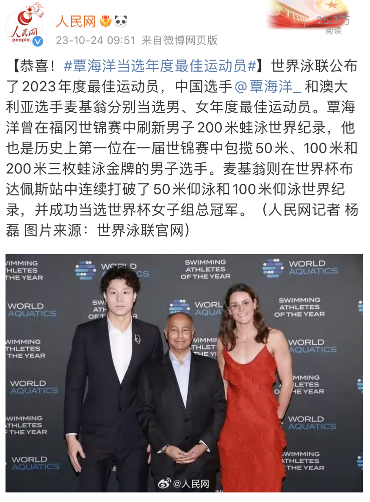 10月23日世界泳联年度最佳游泳运动员评选在匈牙利首都布达佩斯揭晓。中国游泳运动员、同济大学2023级硕士研究生覃海洋荣膺世界泳联年度最佳游泳运动员。