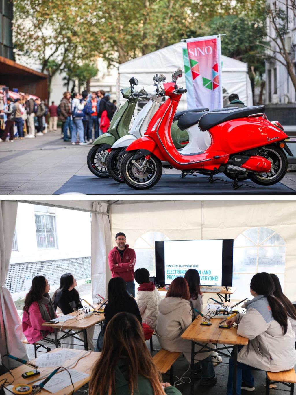 中意师生在印制电路板上焊接电子元件,开发出意大利特色图案的互动作品;在一针一线中,留学生们感受中式非遗传统技艺和中医中药文化的别样魅力;在意大利语小游戏摊位和VESPA摩托车秀前,不少学生纷纷驻足参与,不亦乐乎。