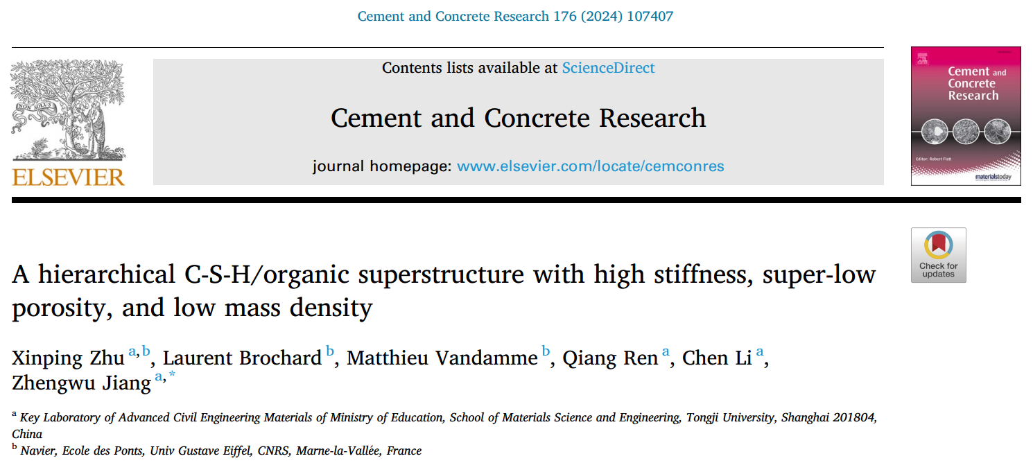 近日,《水泥混凝土研究》(Cement and Concrete Research)在线发表了同济大学材料科学与工程学院蒋正武教授课题组的研究论文“A hierarchical C-S-H/organic superstructure with high stiffness, super-low porosity, and low mass density”。论文通讯作者为蒋正武教授,第一作者为学院博士生朱新平。