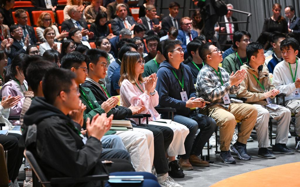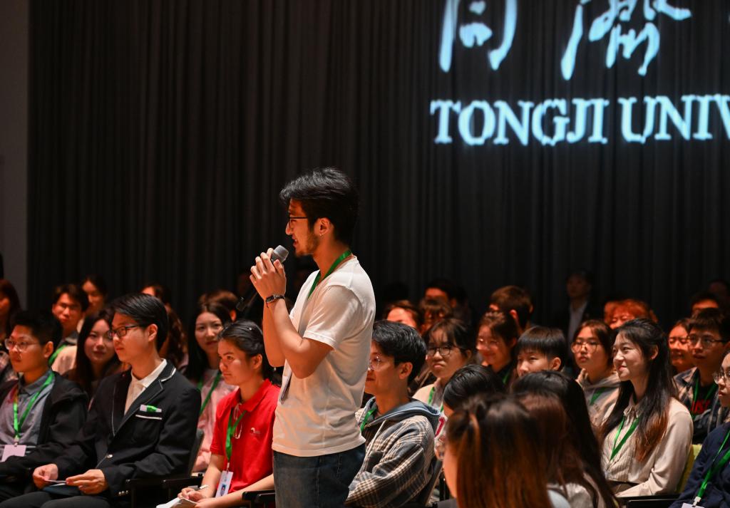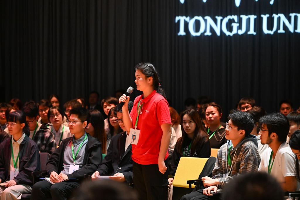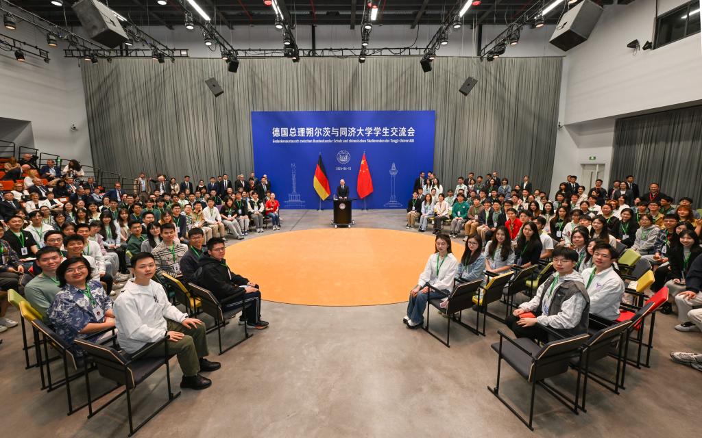 交流会分为对话和提问两个环节。在对话环节,同济大学本硕博各一名学生代表用流利的德语进行自我介绍,围绕中德青少年交流,中德在可持续发展、智慧城市、人工智能等新经济领域发展的未来前景等主题进行了对话。朔尔茨表示,青年人之间的交流具有重要意义。