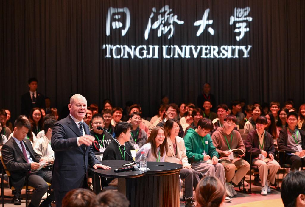 当天上午11时30分许,朔尔茨来到同济大学嘉定校区,在同济大学党委书记方守恩、校长郑庆华、副校长娄永琪的陪同下走进学生活动中心——艺嘉楼。朔尔茨听取了关于同济大学世界一流大学建设特别是国际合作交流情况的介绍,参观了汽车学院大学生方程式赛车车队的作品。他对同济作为中德高教合作桥梁和灯塔在国际化人才培养和科技创新方面取得的成就表示赞赏。