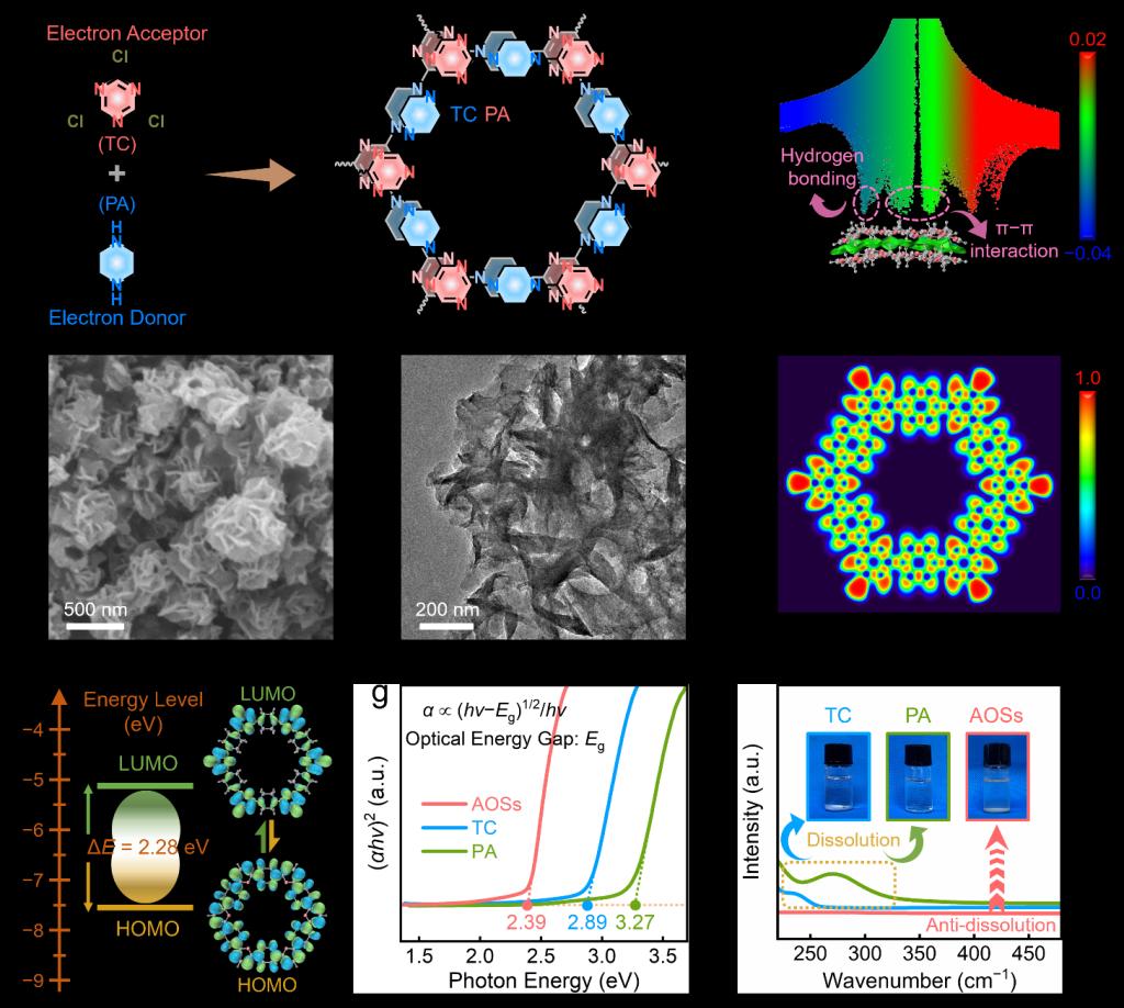 课题组研究显示,电子受体三聚氯氰和电子给体哌嗪通过氢键和π−π平面堆叠自组装形成花状有机超结构,展示出高密度活性位点、高度共轭的双极性结构和低能带间隙,有助于加快电子转移动力学和电极氧化还原速率。