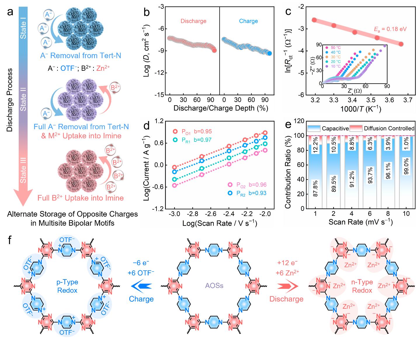 动力学分析和活化能计算表明,有机超结构实现了低反应能垒的Zn2+/OTF−相反电荷交替配位过程,有效消除了相同离子间库伦斥力影响,促进了稳定和快速的两步18e−氧化还原能量存储过程。这项工作为通过活性位点和微结构协同设计提高有机材料储能性能提供了新的视角。