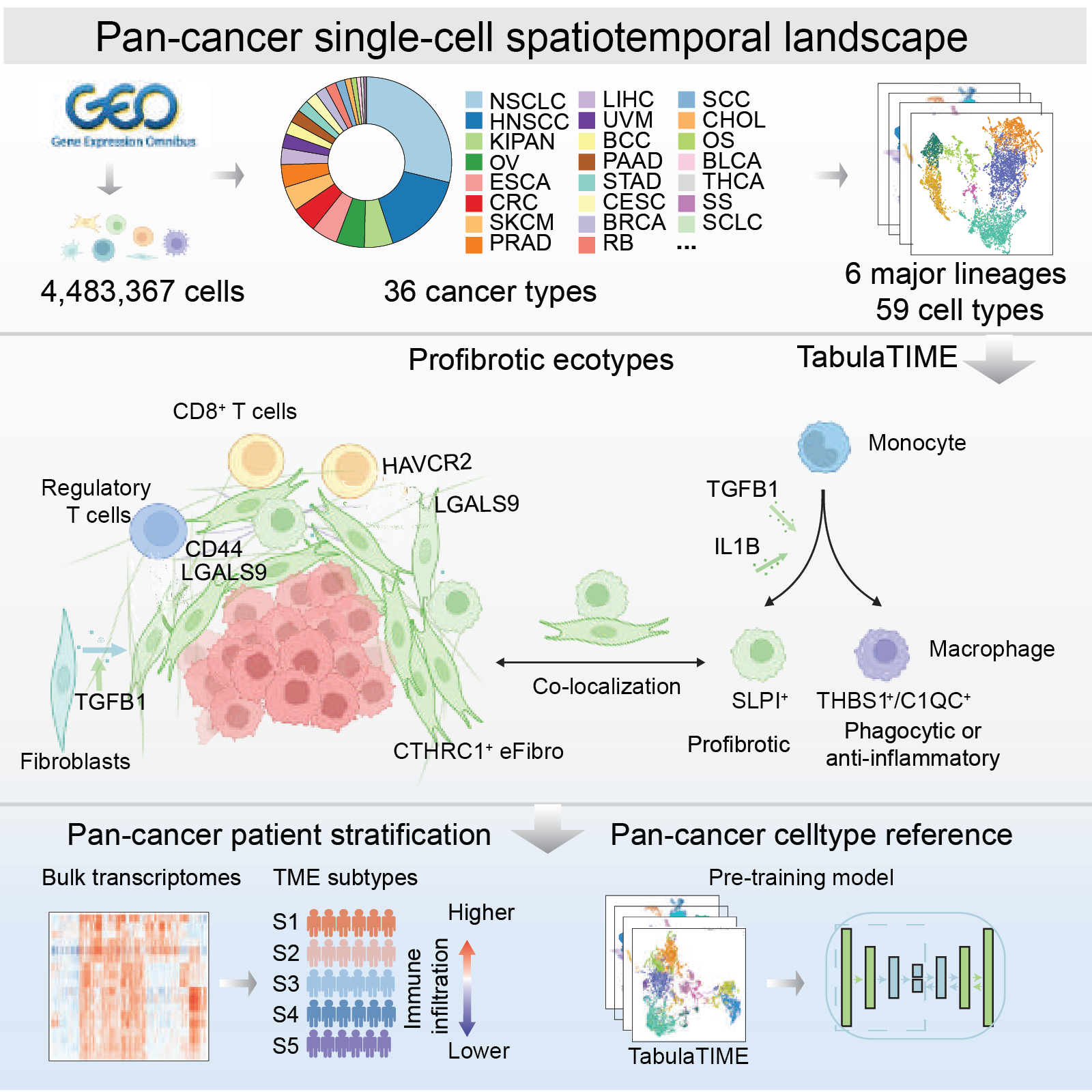 8月25日,同济大学生命科学与技术学院王晨飞团队在《自然肿瘤》(Nature Cancer)上发表了文章“Spatiotemporal analyses of the pan-cancer single-cell landscape reveal widespread profibrotic-associated ecotypes regulating tumor immunity”。该研究集成了来自公共数据集中36种癌症类型746个样本的超过400万个单细胞的数据,以及6种癌症类型62个样本的空间转录组学数据。涵盖癌旁正常组织、癌前病变组织、肿瘤组织和转移性肿瘤样本,并建立了系统描绘肿瘤微环境异质性的泛癌图谱TabulaTIME(http://wanglab-compbio.cn/TabulaTIME/)。研究人员对泛癌尺度肿瘤微环境内多个细胞谱系进行了详细注释,将其分为杀伤型淋巴细胞、调控型淋巴细胞、B淋巴细胞、髓系细胞、成纤维细胞及内皮细胞六个大的细胞谱系,探讨了这些细胞亚型与预后的关系,识别出在肿瘤发生和进展过程中起重要作用的细胞亚型,并对肿瘤特异的细胞类型和多细胞互作进行了深度分析(图1)。