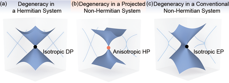 简并态广泛存在于物理系统中,是系统固有对称性的直接体现。以往研究表明,在厄米系统中,简并通常以狄拉克点(Diabolic Points,DP)的形式出现,其特征为本征值简并且对应的本征向量正交,对参数扰动展现出线性响应;而在非厄米系统中,简并点被称为奇异点(Exceptional Points,EP),表现为本征值与本征向量同时塌缩,对参数扰动呈现非线性响应。尽管HP被认为同时具有线性和平方根响应的特性(图1),但以往的观测主要依赖于腔体或波导中的受限条件,且需要对非厄米参数进行精细调控。研究团队利用投影非厄米系统,在开放系统中实现了散射HP,系统揭示了其形成于相反手性奇异曲线交汇处的机制,并展示了沿不同参数方向呈现线性或平方根响应的各向异性灵敏度特征。